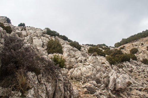 Alcanzamos los destrozados muretes de mampostería y la senda que en su último tramo, por la derecha, se dirige a la Senda del Caracol, Las Escalerillas. Nosotros seguimos progresando directos hacia arriba. La senda se acaba pero el rastro es evidente y hay algún esporádico mojón.