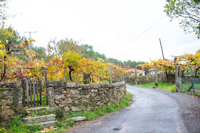 Salimos del pueblo por una estrecha corredoira que poco después conecta con un camino asfaltado que entre casas de campo comienza a elevarse. Pasamos por delante de la Adega do Boiga, que como otras bodegas dispersas en la zona ocupan antiguas galerías mineras.