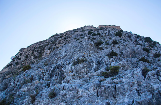 Remontamos por el rocoso barranco de la Moleta rodeándolo por la izquierda, para luego comenzar a subir por una especie de lomo pétreo y peñascoso. A cada paso que damos los muros del castillo van creciendo ante nuestros ojos. Sorteamos arcaicos y desolados bancales con muretes de piedra seca.