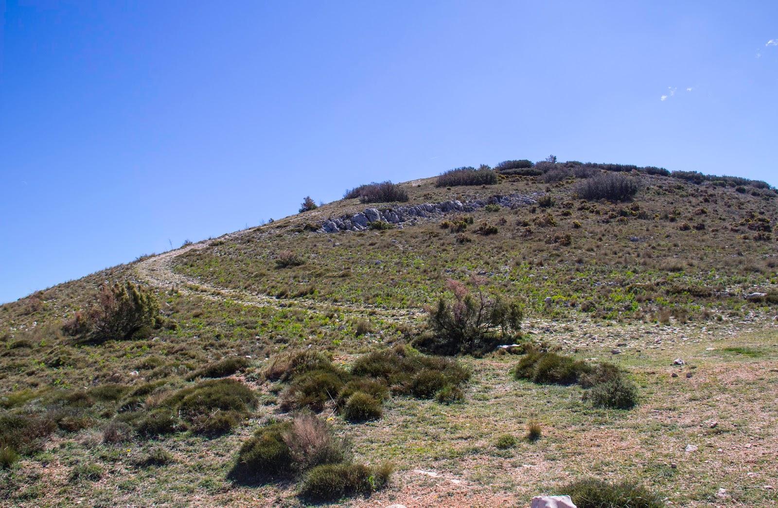 Siguiendo las curvas de desnivel y sin bajar al cauce de la pequeña rambla, proseguimos rodeando el Alt de la Creu (1.113 m.) sin dificultad alguna, hasta enlazar con el ancho camino del PR-CV 10 que llega al Port de Tagarina.