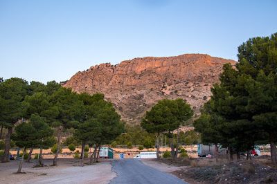 Iniciamos por la pista asfaltada que va al pantano, dejando atrás la mole del Cantal del Pixador por la que se asoma el Maigmó. Pasamos junto a la valla de una gran finca de escalonados bancales de olivos con muretes de piedra, y en el otro lado almendros en flor.