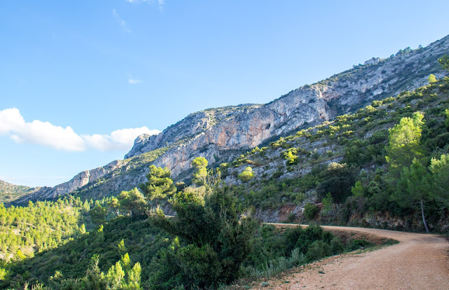 Última mirada al espolón del Benicadell y por camino carretero menos transitado cambiamos de vertiente para ir cerrando el círculo de la ruta. La vegetación cambia y nos acompañan redondeadas lomas.