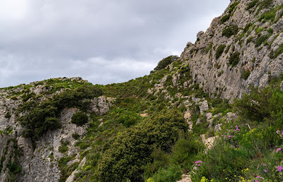 Mientras tanto nos posicionamos en la vertiente entre el Barranc de la Bassa de Ciment y la cara sureste del Benicadell que a medida que vamos bajando moderadamente nos muestra la cara menos conocida de la montaña.