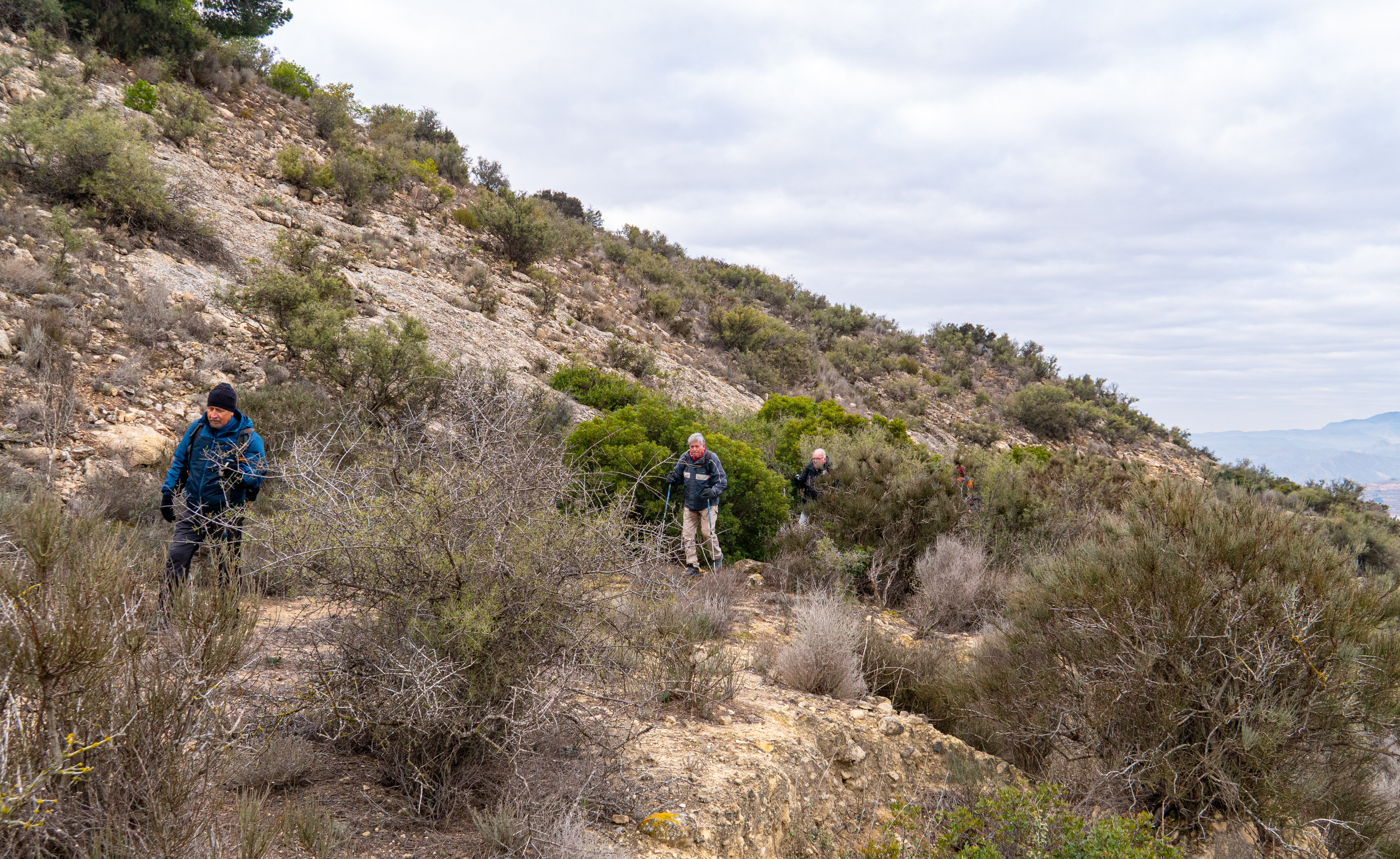 Entramos en la umbría rodeando la segunda loma hasta que el camino queda taponado por la vegetación y unos pinos. Tenemos que hacer una pequeña trepada y subir entre las rocas al otro lado de la loma donde el camino se torna sendero.