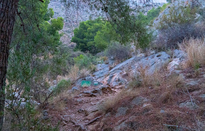 Queda otra bajada tortuosa por un pedregoso barranco que las fuertes lluvias han deteriorado en exceso; entre grandes pedruscos y matorral al pie de los primeros pinos de ladera de este vertical barranco.