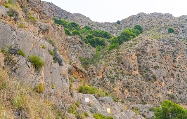 Es un inclinado desnivel hacia el oeste, con rampas y revueltas recorriendo todo el contorno de la sierra, aprovechando la parte alta de los barrancos para seguir subiendo. La mole peñascosa parece inaccesible, pero siempre hay un resquicio por donde seguir avanzando. Admiramos innumerables covachas y recovecos.