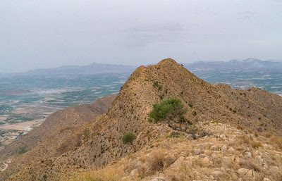 La vegetación comienza a escasear, solo algo de matorral bajo se adhiere al rocoso terreno. Tomamos una empinada rampa que parece una pedrera para dirigirnos a una arista lateral, donde tenemos una extensa vista panorámica de Redován y Orihuela.